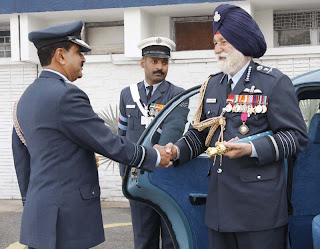The Marshal of the Indian Air Force Arjan Singh, visited the Western Air Command headquartered at Subroto Park, New Delhi today. On his arrival the Marshal was received by Air Marshal NAK Browne, Air Officer Commanding-in-Chief, Western Air Command and was presented a Guard of Honour.